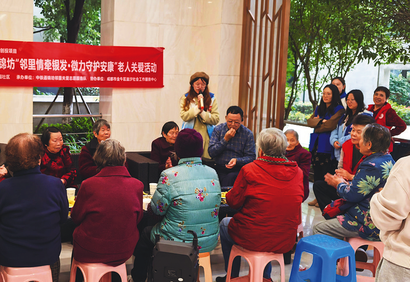 近日,中铁二局房地产物管公司组织开展重阳节敬老关爱系列志愿活动,为社区老者提供义务理发、清洗地毯、安全检查、政策宣讲、反诈宣传等志愿服务。图为志愿者正在进行反诈宣传。 郭婷婷 摄