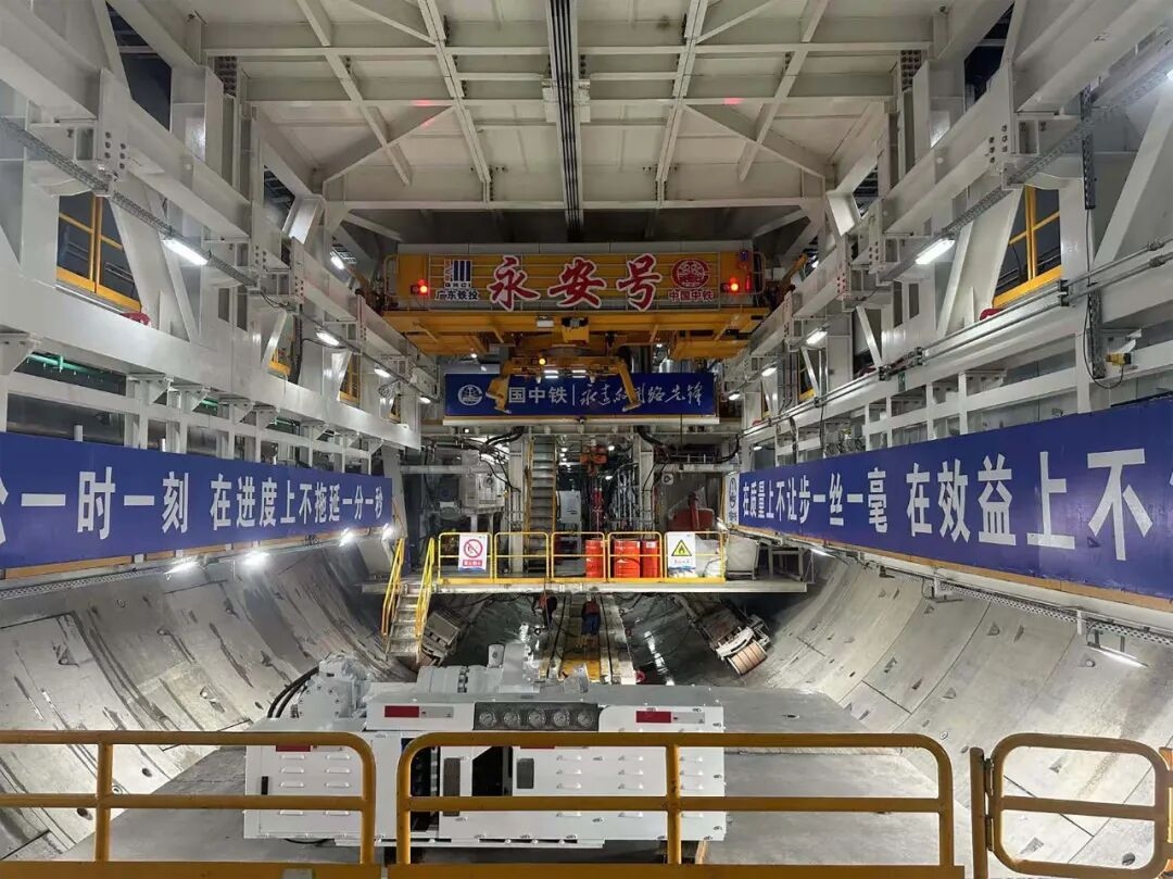 针对圭峰山隧道沿线地形复杂,多个风险源交织的工程特点,研发团队设计制造了中国首台14.29米超大直径土压/TBM双模盾构机“永安号”(“中铁1169号”)。其主机长14.3米,总长117米,总重约4250吨。研发团队为“永安号”针对性地配备了八主梁面板式刀盘,提高了刀具的抗冲击及耐磨性。突出智能建造理念,搭载管片智能吊运系统、超前地质预报系统、有害气体监测系统、土仓可视化系统、刀具状态监测系统、故障诊断应用系统等功能性辅助系统,保障掘进机在处于软弱围岩和硬岩和两种模式间快速转换中,始终安全、高效掘进。