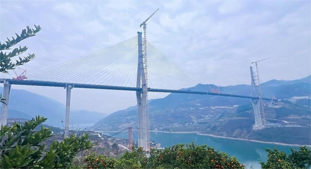 大溪河特大桥地处奉节县李家屋场滑坡与土狗洞滑坡群核心影响区,两岸呈“U”字形陡峭峡谷地貌,施工场地受限;312.4米主塔需全程高空作业,易受大风、暴雨等极端天气干扰;650米主跨钢混组合梁在刚度转换阶段的线形精准调控是桥梁建设领域公认的技术难题。面对困难,大桥设计团队创新应用多项技术,在国内首次研发并应用了“外置式钢锚管”索梁锚固体系、首次在组合梁斜拉桥中创新了“分区段NC/UHPC预制板以及UHPC湿接缝”体系、首次采用“整流罩+下中央稳定板”的“零涡振”气动组合措施;同时,实现主梁、锚管、桥面板、拉索等构部件全要素装配化,推动了超大跨度桥梁建造方式向工业化、标准化和智能化的革命性升级。