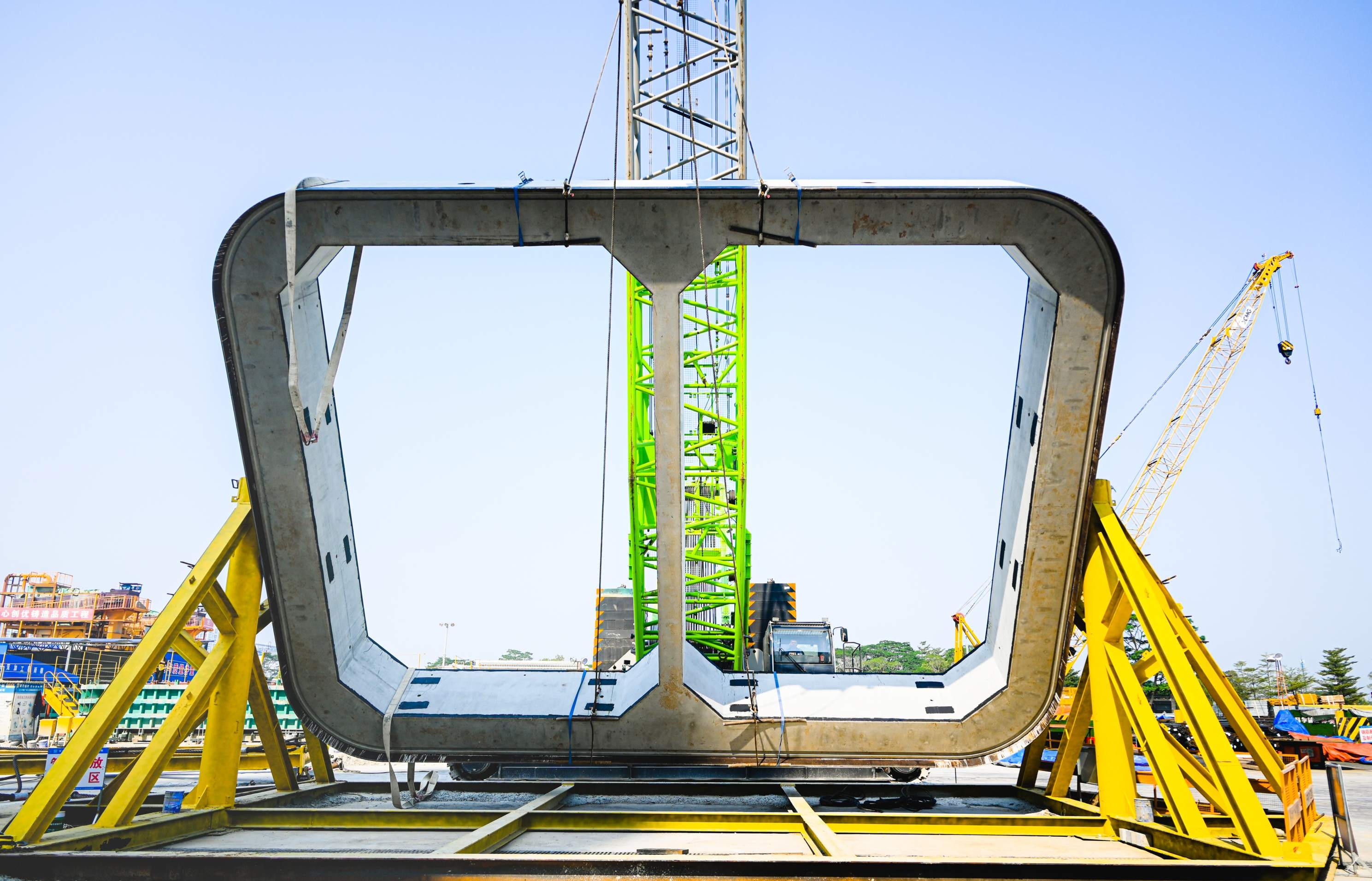 该顶管隧道是深南中城际接驳的关键预留工程,毗邻香山站至十二涌左右线盾构区间、紧邻茅龙水道,全长127.5米,管底埋深约26.21米,采用13.04米×9.61米的超大断面预制钢筋混凝土矩形管节,是目前国内超大直径泥水顶管工程之一。所用管道单节重达146.1吨,采用高强度抗渗混凝土,并应用承插式“F”型接头,从材料与工艺上双重保障隧道结构的整体安全性、稳固性与耐久性。