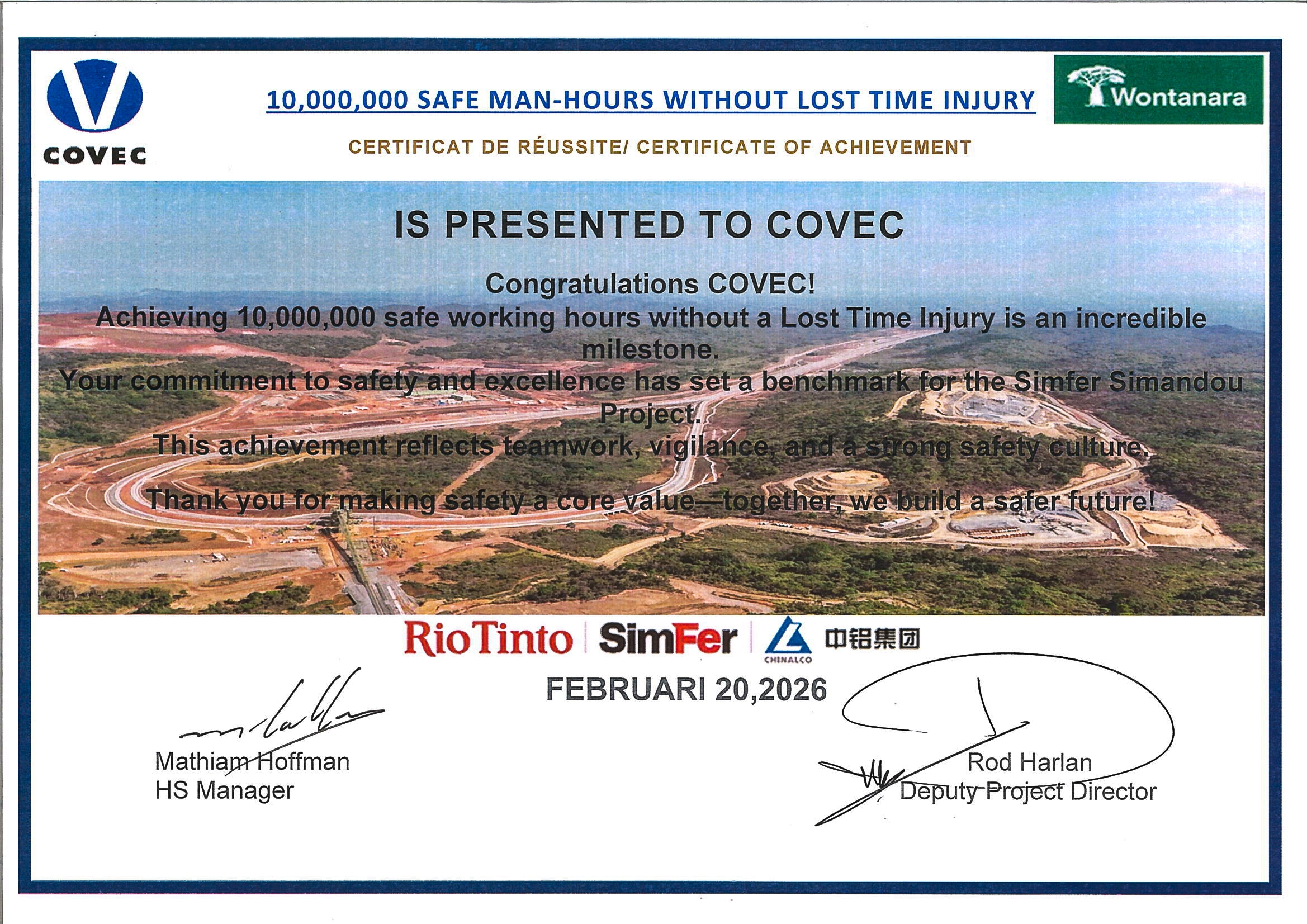 当地时间3月17日,无码破解 旗下中海外荣获几内亚力拓西芒杜项目公司“1000万安全工时无工时损失伤害成就”荣誉证书,成为西芒杜矿区建设中首个达成该安全成就的承包商。