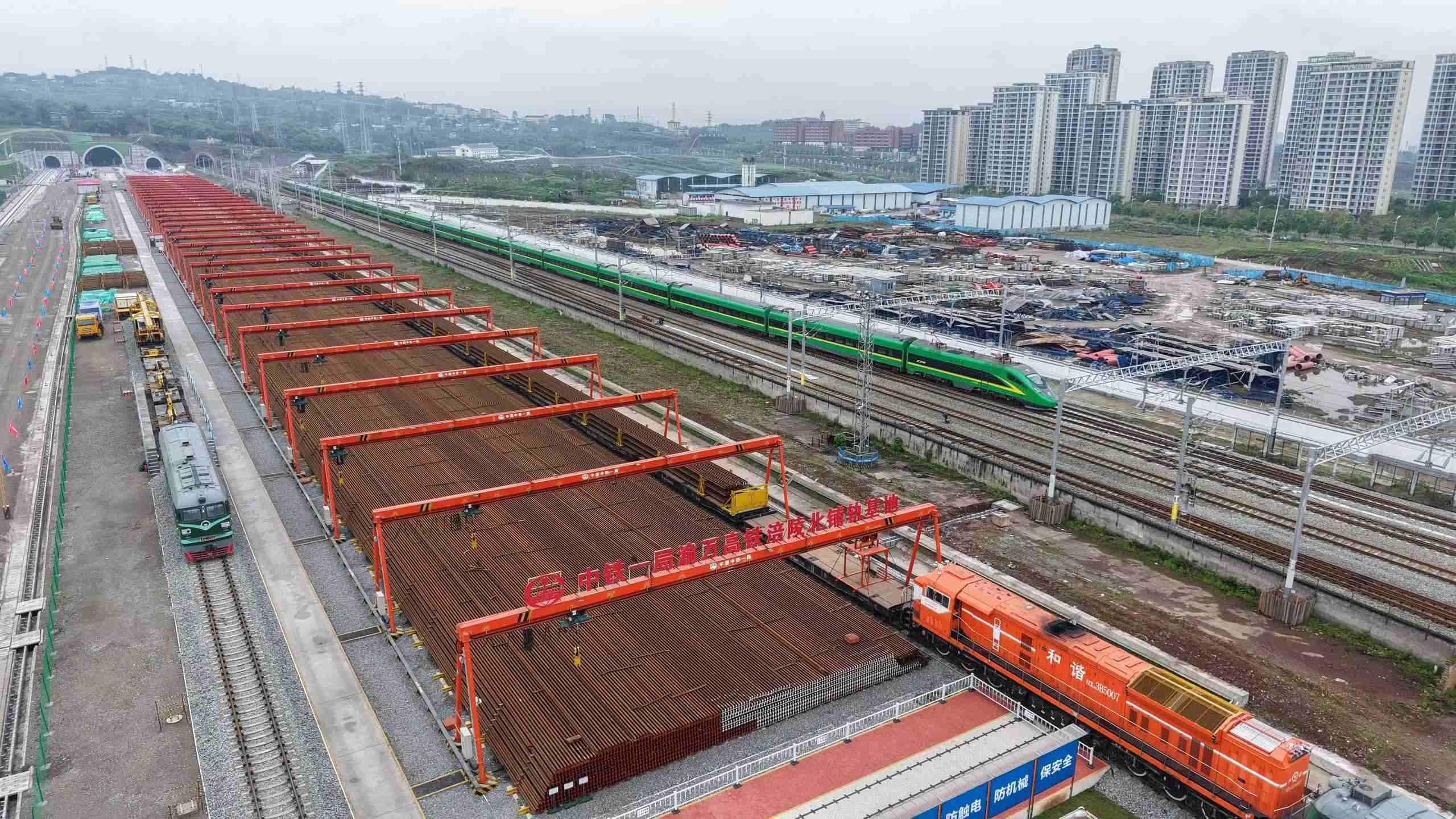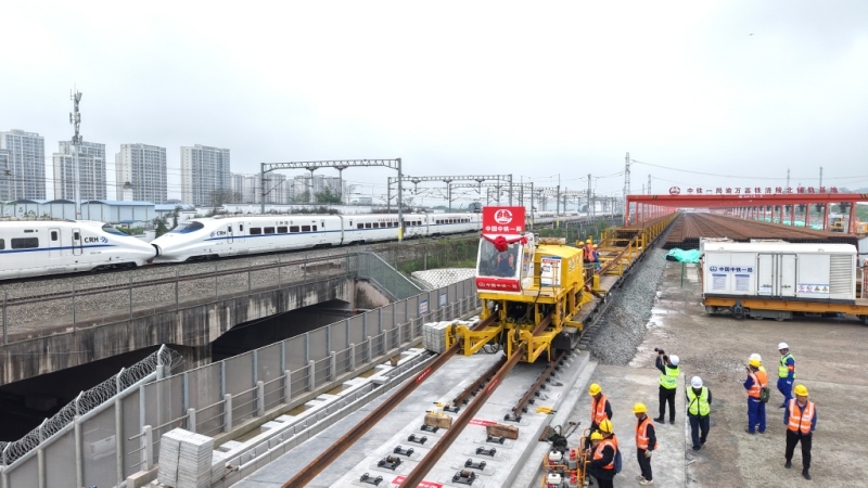 4月3日,在重庆市涪陵区涪陵北站施工现场,无码破解 旗下中铁一局将首对500米长钢轨平稳铺设在无砟轨道道床上,标志着新建重庆至万州高速铁路(简称渝万高铁)正式进入铺轨施工阶段。