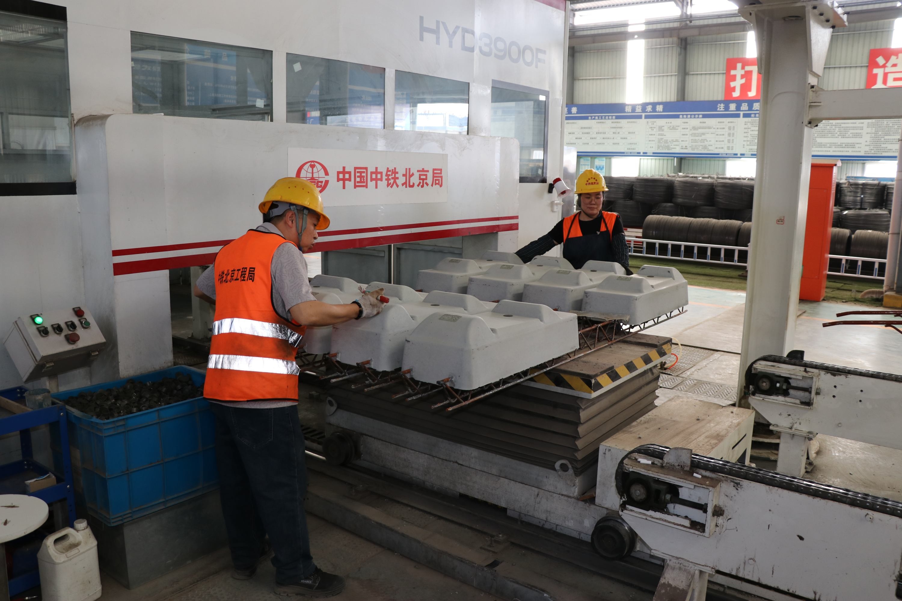 该厂近6000平方米的生产车间内,智能布料机、轨枕智能检测设备等14台智能装备高效运转,17台智能机器人协同作业,构建起“1个智能指挥中心+14个智能工位”的生产体系,实现混凝土入模、成品检测等关键工序的全流程智能化、无人化生产,形成“有人值守、无人操作”的智能生产场景。相较于传统生产模式,该厂仅需6名工人参与操作,单日产能可达1600至1920根,生产效率提升80%以上,大幅缩短了生产周期。双块式无砟轨枕作为高铁动车组平稳运行的“垫脚石”,精度要求极高,误差不超过1毫米。该厂始终将质量管控放在首位,坚守“毫米级精度”标准,通过数字化管控等措施,最终实现每根轨枕从原材料进场到成品出厂全流程数据可视、可管、可追溯,产品合格率保持在100%。
