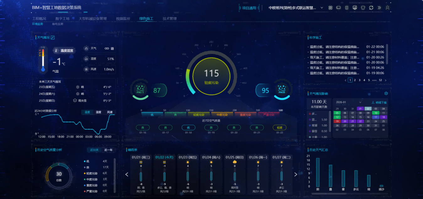 “通过物联网设备,实时采集扬尘、噪声、能耗等数据,当监测数值超过阈值,将自动识别异常并预警。我们可以远程掌控环境变化,根据数据,有针对性地进行调整,打造绿色工地。”项目副总工岳超介绍道。项目通过智慧建造平台,结合自动喷淋、节能设备和低碳技术,实现绿色施工闭环管理,施工现场噪声、建筑垃圾回收利用率、扬尘超标率、施工能耗均达到国家标准。