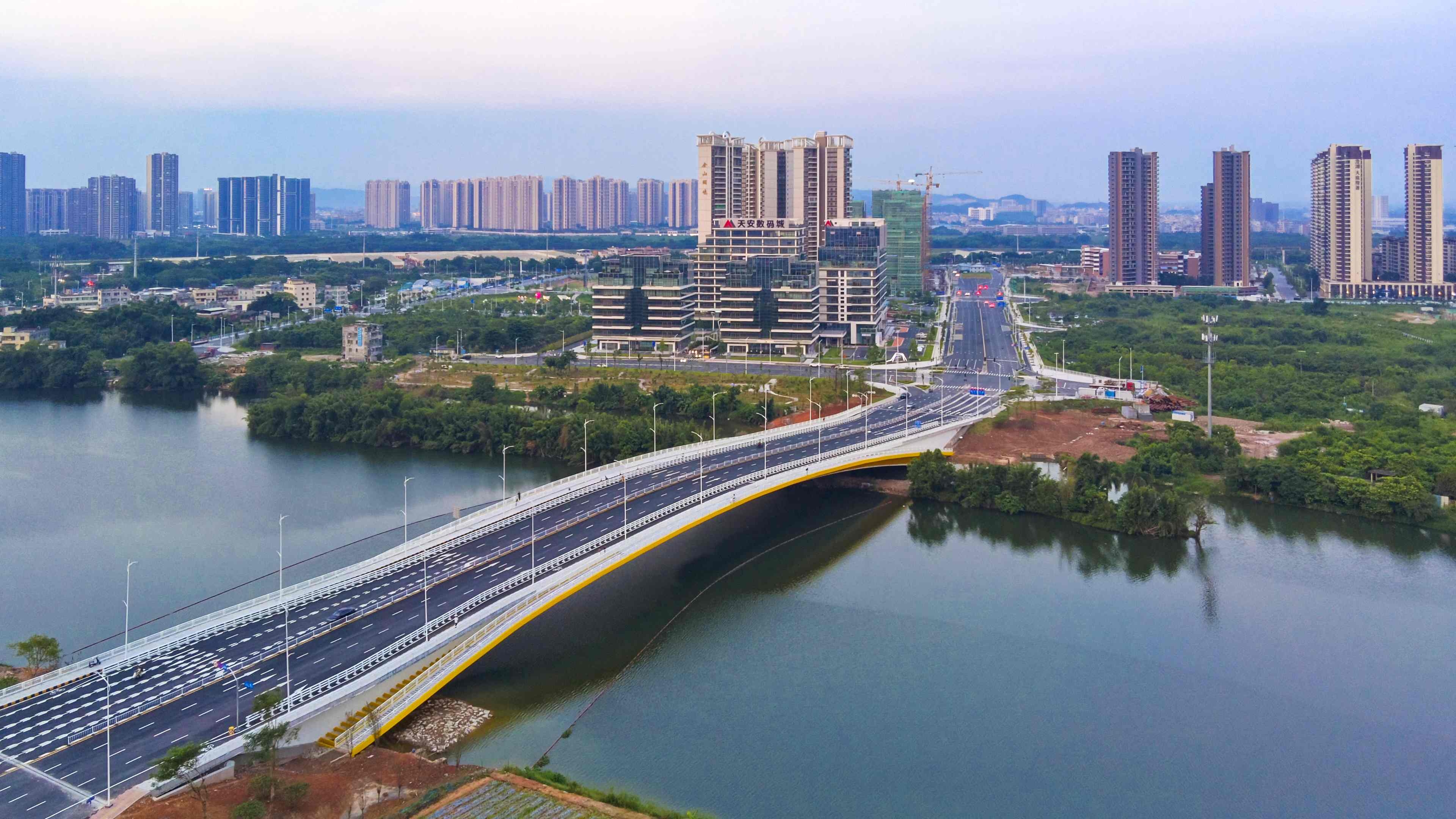 惠城区金山湖二号桥是惠州市重点工程,主桥长273米,引道308米,采用净跨200米的单跨上承式钢箱坦拱设计,于2024年8月建成。