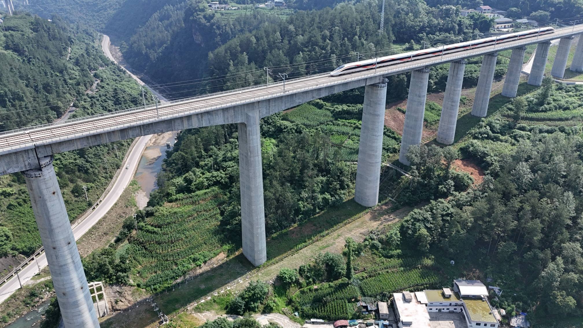 2023年8月24日,重黔铁路石梁河双线特大桥4号墩2×120米T构连续梁顺利合龙。该桥墩的高度和跨度目前在国内高铁在建T构连续梁高、跨均为最大。