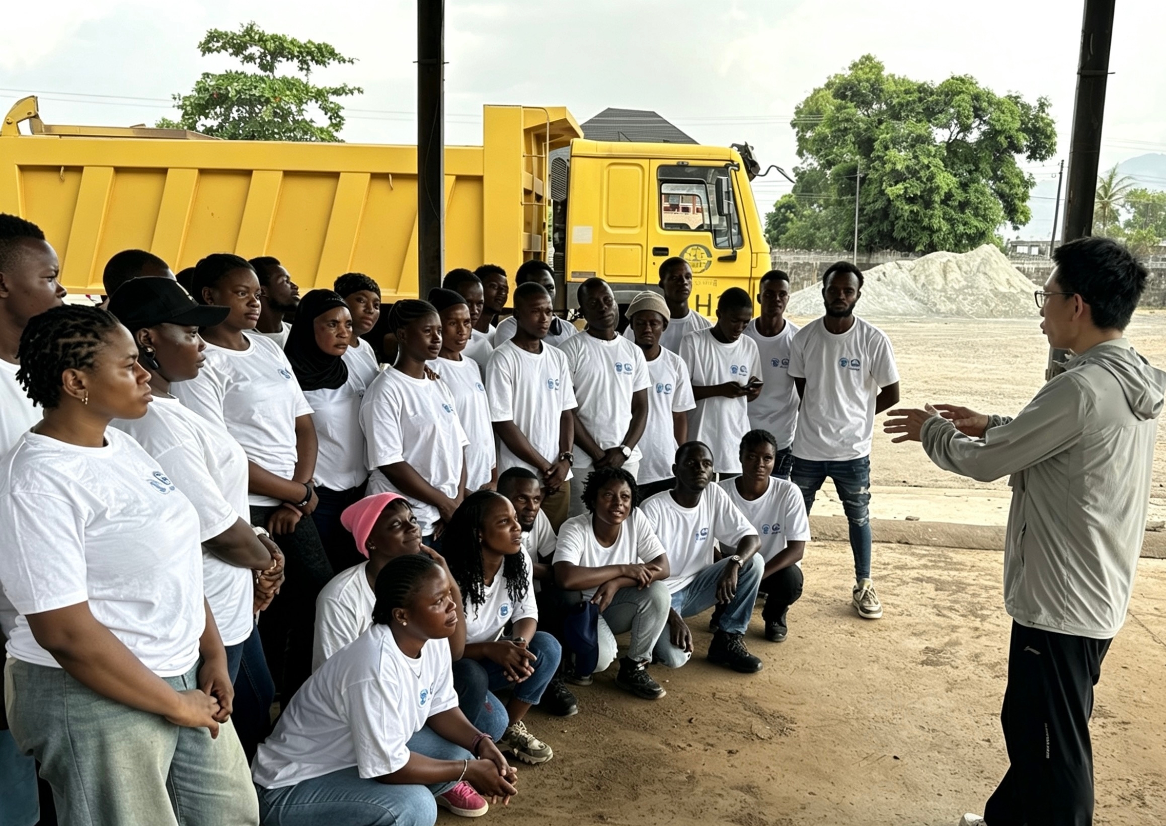 午后的阳光洒在训练场上,发动机的轰鸣声与专注的指导声交织在一起。最近,一群塞拉利昂的青年学子们正在中国老师的带领下,练习卡车驾驶操作。这里是“卓越技能学院”职业培训基地训练现场。